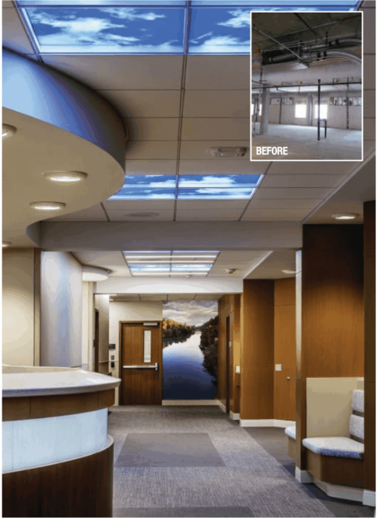 The result is corridors that invite you forward to the next SkyCeiling. They also help create an oasis where patients are encouraged to sit and socialize.